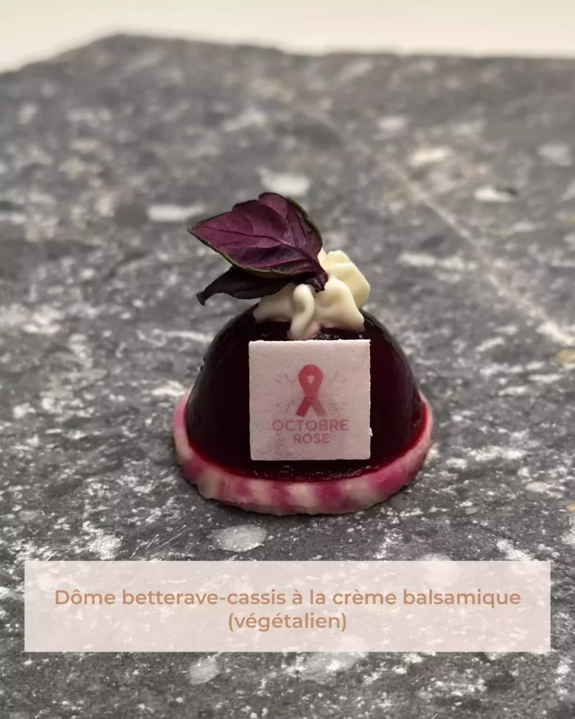 - Une pièce cocktail salée : le dôme Betterave cassis à la crème balsamique, pièce végétalienne